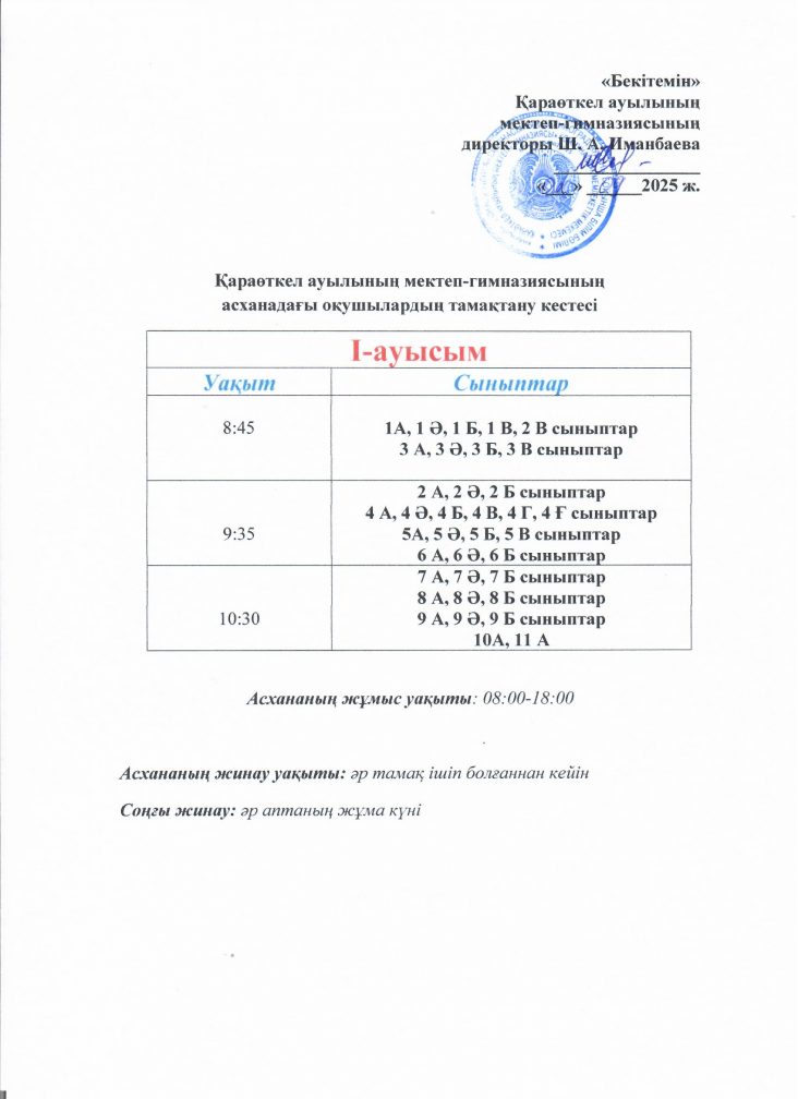 2025-2026 оқу жылында оқушылардың тамақтану кестесі