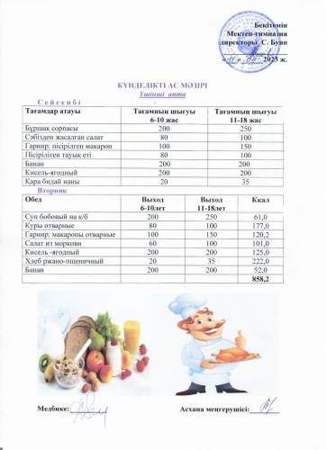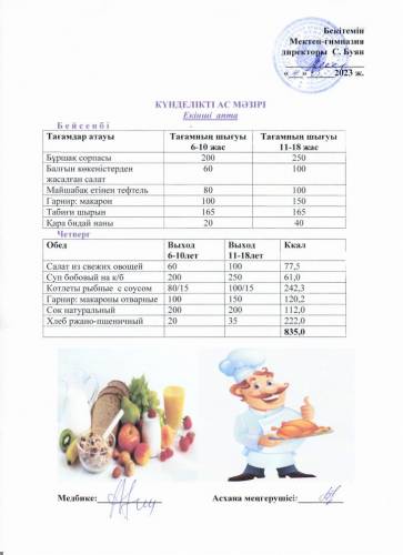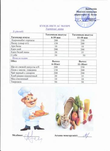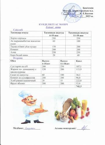 2023-2024 оқу жылы оқушыларға арналған күнделікті ас мәзірі