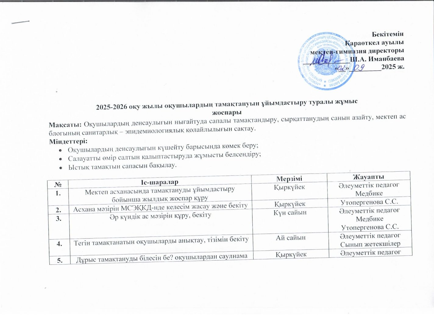 2025-2026 оқу жылы оқушылардың тамақтануын ұйымдастыру туралы жұмыс жоспары