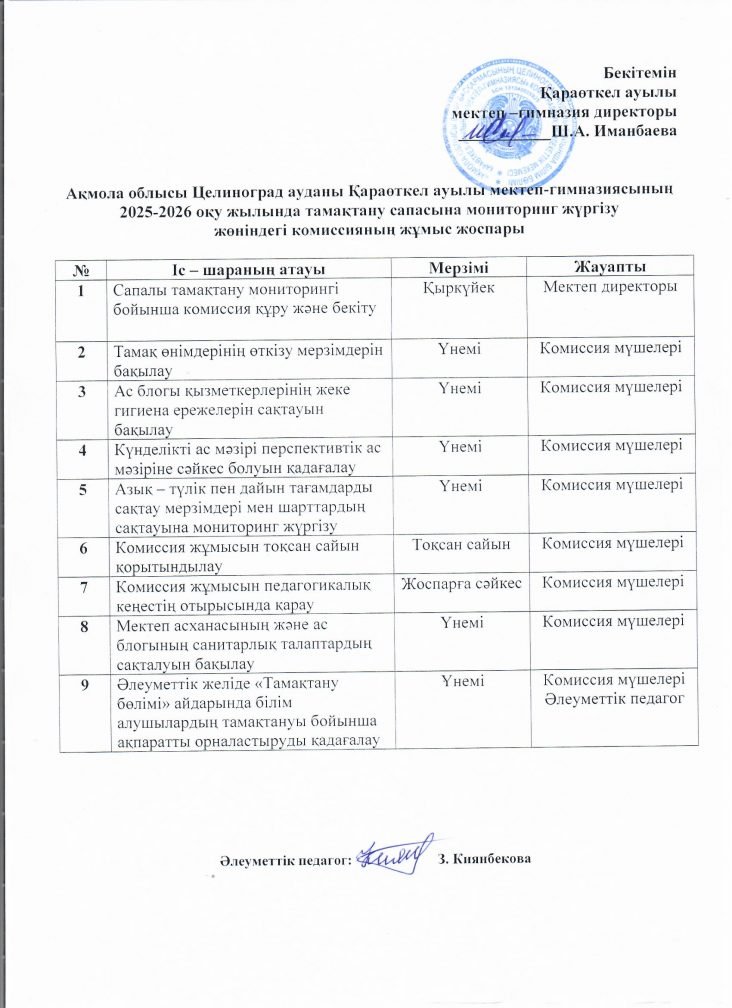 2025-2026 оқу жылы сапалы тамақтану мониторингі бойынша жұмыс жоспары