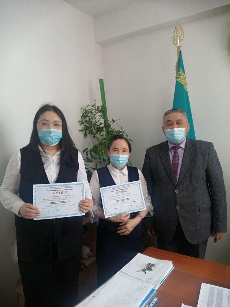 Ақпан айында өткен аудандық білім бөлімінің әдістемелік кабинетінің ұйымдастыруымен өткен озық тәжірибе тарату жұмысына белсене қатысып, өз іс-тәжірибесімен бөліскен бастауыш сынып мұғалімдері Тарбақа Жанаргүл және Шойдонда Марияш сертификаттармен марапатталды.