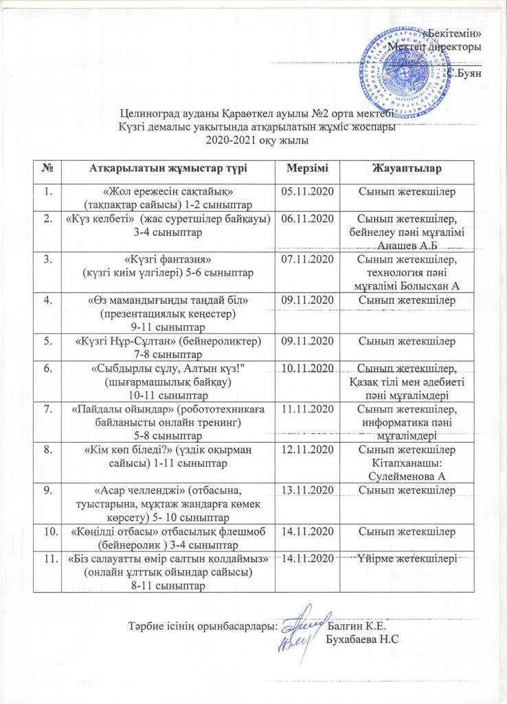 Целиноград ауданы Қараөткел ауылы √2 орта мектебі. Күзгі демалыс уақытында атқаратын жұмыс жоспары 2020-2021 оқу жылы