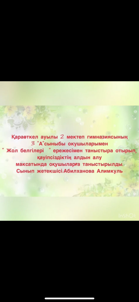 Анықтама Қараөткел ауылы 2 мектеп гимназиясының 3 "А" сынып оқушыларымен " Жолда жүру ережесі" тақырыбы бойынша жол белгілерін есте сактау мақсатында кауіпсіздік ережесі түсіндірілді. Оқушылардың сұрақ жауаптары тыңдалып, жол қауыпсіздігінің алдын алу шаралары көрсетілді. Сынып жетекшісі: Абилханова Алимкуль